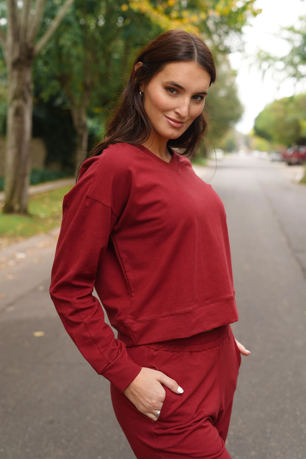 Confeccionado en algodón rústico, es un buzo liviano, suave y cómodo, ideal para sumar a este invierno. Tiene escote en V, mangas con recorte, puños definidos y un largo a la cintura que lo hace súper combinable y sentador.