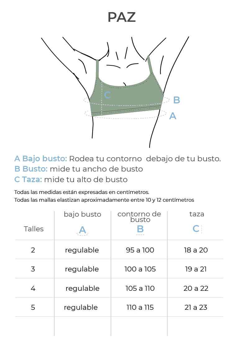 El corpiño Paz es sinónimo de sencillez y comodidad. Con un corte tipo top, este modelo está pensado especialmente para busto grande, ofreciendo capacidad. Este año modificamos sus breteles: los hicimos más anchos, para un mejor sostén. Si elegis este modelo, regulas vos misma el contorno y bajo busto con sus coletas. Es el modelo ideal para quienes buscan estar cómodas.