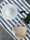 Liviana, práctica y perfecta para acompañarte momentos de relax al aire libre. Su tamaño la hace ideal para la playa, el parque o la pileta. Diseño rayado en tusor disponible en tres combinaciones: beige&crudo, verde&crudo, y rosa&crudo. Además tiene delicados flecos de algodón, que le suma un toque boho.